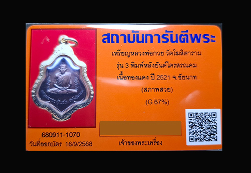 ( เคาะเดียว ).เหรียญหลวงพ่อกวย หลังยันต์ไตรสรณคมณ์ ปี 2521 ( สภาพสวย ) ตลับทอง |