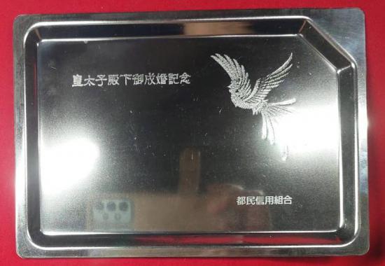 กับถาดสแตนเลส ที่รำลึกพระราชพิธีเสกสมรสของสมเด็จพระจักรพรรดิอากิฮิโตะ ญี่ปุ่น ขนาด 3 x 6.5 นิ้ว |