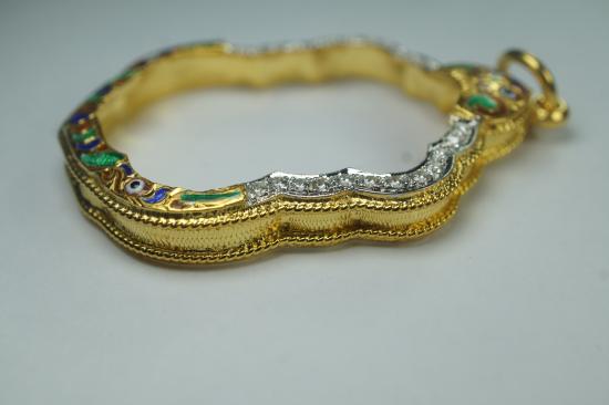 งานกรอบเงินแท้ ( มือหนึ่ง ) ชุบทองแท้ ใส่เหรียญ เสมา หลวงปู่ทิม หรือขนาดไกล้เคียง ยกซุ้ม หัวสิงห์ ฝังเพชร CZ ข้างเกลียวโปเต้ ยับทราย งานขึ้นมือ ( มาตรฐานงานตัวเดียวกับกรอบทองคำแท้ ) น้ำหนัก 10.06 กร |