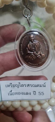เหรียญไตรสรณคมน์ เนื้อทองแดง หลวงตาม้า วัดถ้ำเมืองนะ พร้อมรอยจารหลวงตาม้า เลี่ยมจากวัดพร้อมประคำ |