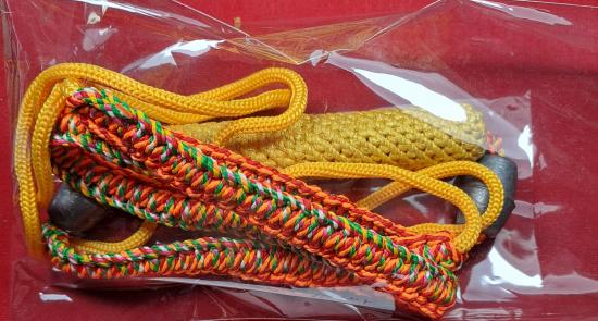 ตะกรุดสามกษัตริย์ หลวงพ่อเอื้อน วัดวังแดงใต้ ดอกยาว 4 นิ้ว ด้านในหลวงพ่อลงอักขระที่แผ่นโลหะ 3 แผ่น แล้วม้วนซ้อนกัน ถักด้วยเชือกครอบตะกรุด ลงสีทองด้านนอก มีลูกสะกดซึ่งหลวงพ่อจารไว้ด้วยที่ด้านข้าง 2 อัน พิเศษถักสายสำหรับห้อยเอวด้วยมือใช้ได้เลยครับ ตะกรุดหลวงพ่อเด่นทั้งด้านคงกระพัน แคล้วคลาด มหาอุต