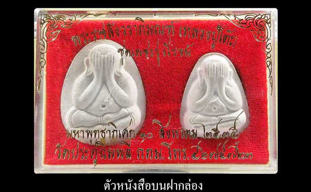 สำหรับพระปิดตา รุ่นเพชรรุ่งโรจน์ชุดนี้ประกอบด้วย พระปิดตาพิมพ์ใหญ่จัมโบ้ เนื้อผงขาวฝังตะกรุดทองคำคู่ ขนาดประมาณ 2.6 x 3.4 ซม. และ พิมพ์ปลดหนี้ เนื้อผงขาวฝังตะกรุดเงินคู่ ขนาดประมาณ 2.2 x 2.7 ซม. หลังยันต์นะ สภาพพระสมบูรณ์ ไม่ผ่านการใช้ อยู่ในกล่องเดิมจากวัด รับประกันความแท้และความพอใจตามกฏ