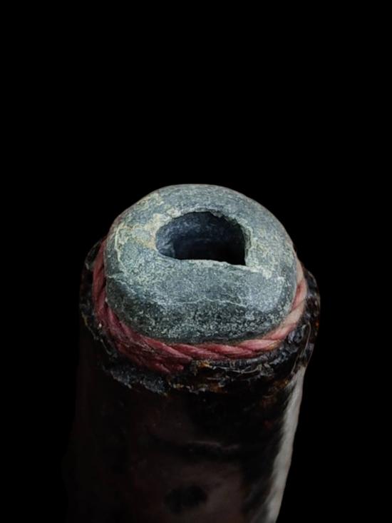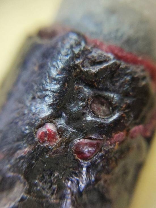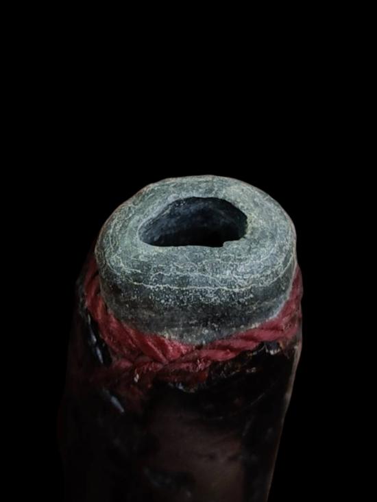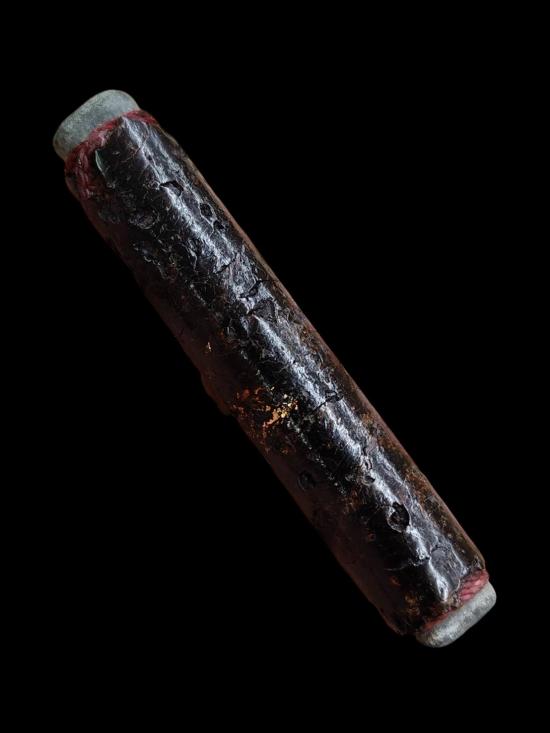วัดใจ ตะกรุดเก่า ใส้ตะกั่ว พันเชือกแดงจุ่มรัก หนาๆ ยาว 3นิ้ว ไม่ทราบที่ |