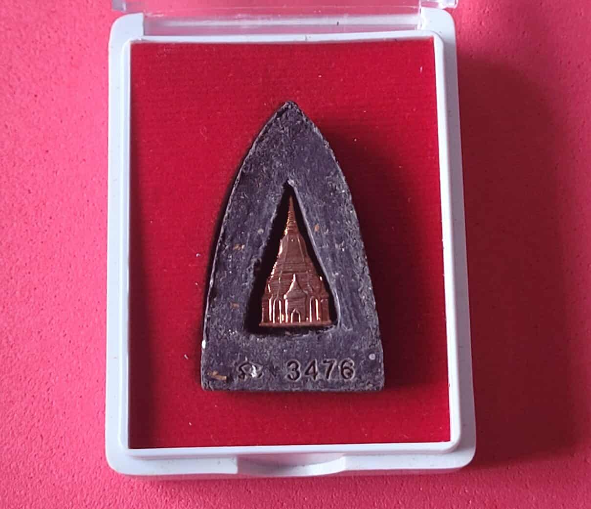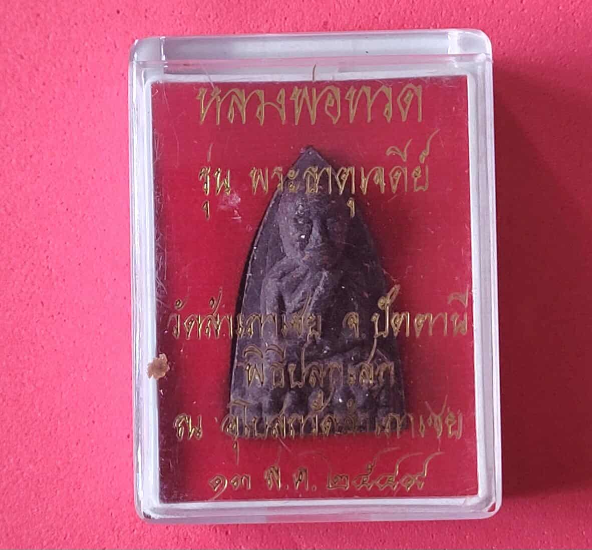 หลวงพ่อทวด พิมพ์เตารีด รุ่นพระธาตุเจดีย์ วัดสำเภาเชย จ.ปัตตานี หลังธาตุเจดีย์ ตอกโค๊ด นะ 3478 ลพ.ทอง ปลุกเสก ปี 2549 มาพร้อมกล่องเดิมจากวัด |