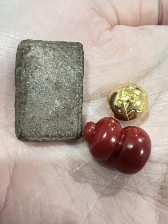 มีลูกอมเจาะรูเนื้อโลหะ มีอักขระรอบลูกอม มีน้ำเต้าเจาะรูหัวท้าย และมีพระพิมสี่เหลี่ยม