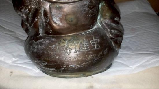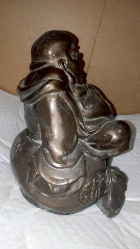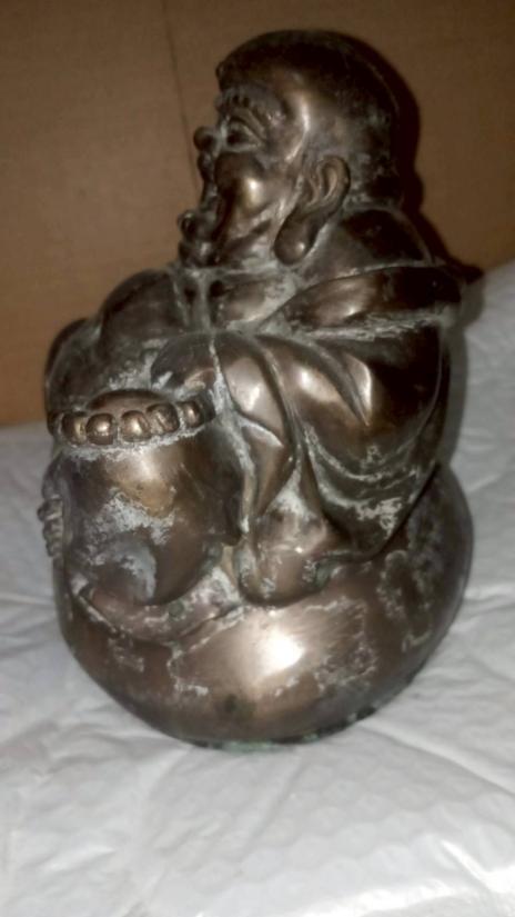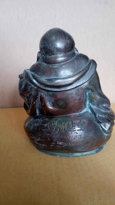 พระบูชาจีน พิมพ์พระสังกัจจายน์ หน้าตัก 5.5 นิ้ว ความสูงรวมฐาน 6.5 นิ้ว เนื้อทองเหลืองโลหะผสม ก้นอุดผงผสมเงินแบงค์ไทย ปิดแผ่นยันต์ดวง รุ่นรวยไม่เลิก ผีอักขระภาษาจีน สภาพผิวหิ้ง |