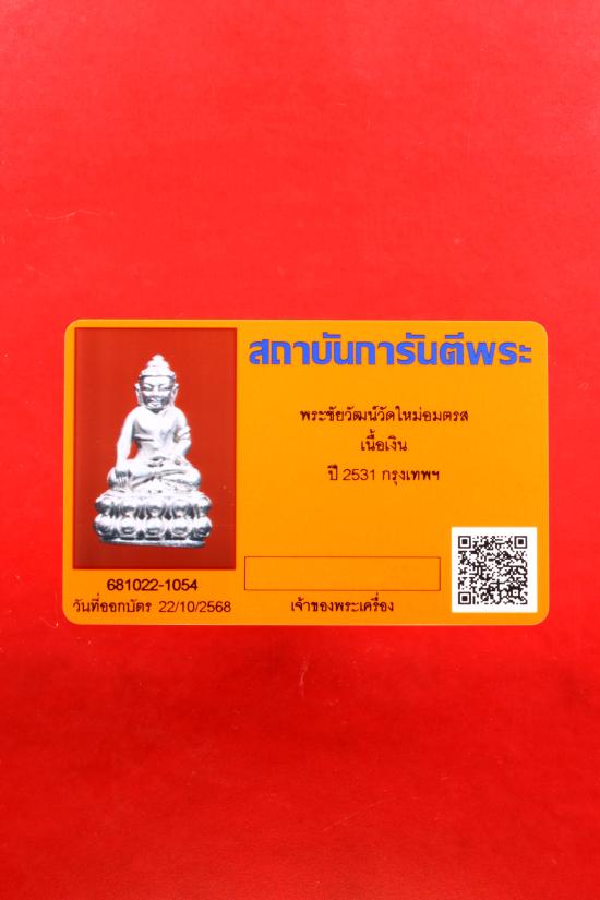 พระชัยวัฒน์ วัดใหม่อมตรส(บางขุนพรหม) เนื้อเงิน ปี 2531 พร้อมบัตรรับรอง |