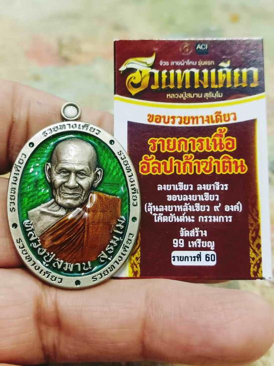 วัดใจ 100 เหรียญรวยทางเดียว หลวงปู่สมาน ที่พักสงฆ์เขายางหัก จ.ราชบุรี ปี 2566 เนื้ออัลปาก้าซษติน ลงยาเขียว ขอบ จีวร หมายเลข 71 สร้าง 99 กล่องเดิม |