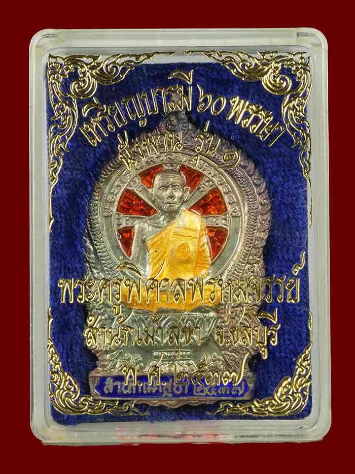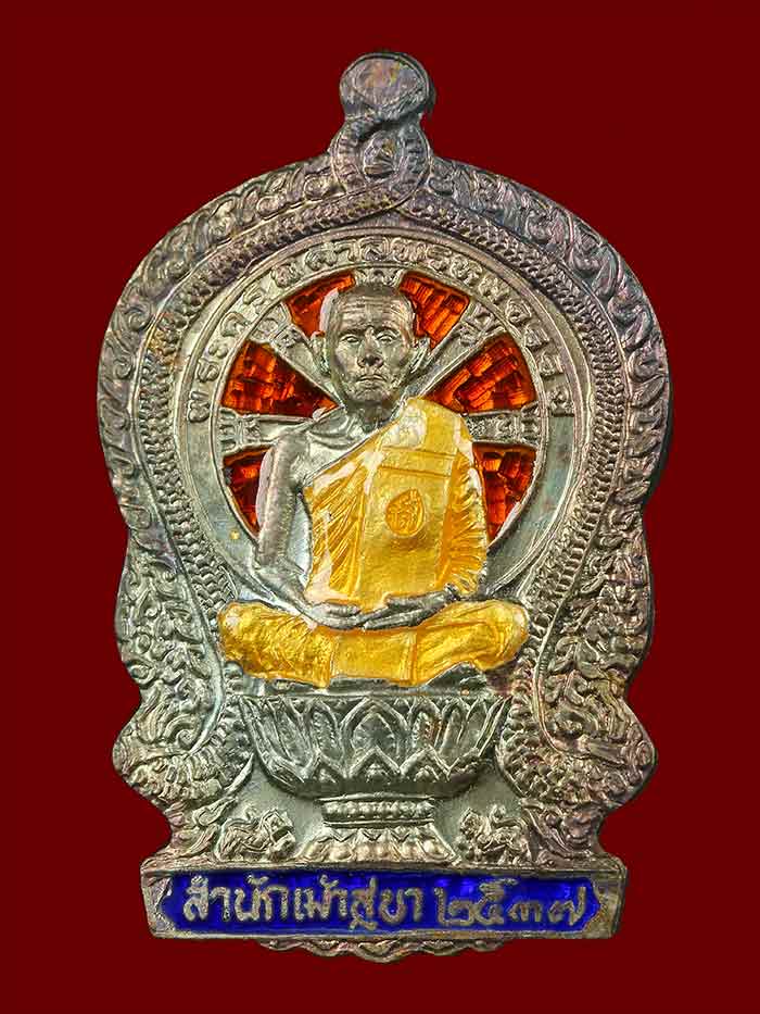 วัดใจ เหรียญนั่งพานรุ่นแรก หลวงพ่อสวัสดิ์ วัดเม้าสุขา เนื้อเงินลงยา ปี37 สภาพสวยเดิมตากล่อง เลข90