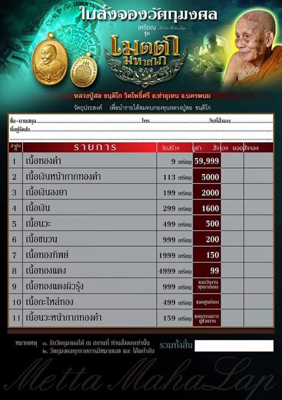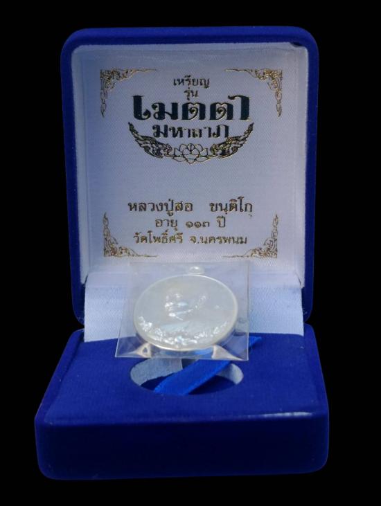 เหรียญเมตตามหาลาภ หลวงปู่สอ ขันติโก เนื้อเงิน หมายเลข ๓๖ จำนวนการสร้าง 299 เหรียญ นี้เป็นที่กล่าวขานว่าเป็นเหรียญมีชีวิต แววตา ใบหน้า รอยยิม สวยงาม