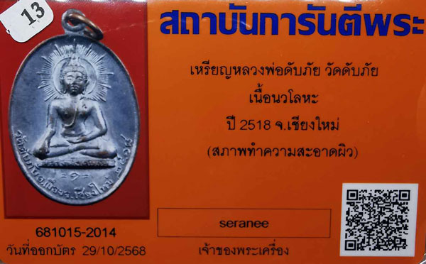 เหรียญหลวงพ่อดับภัย วัดดับภัย รุ่นแรก เนื้อนวโลหะ ห่วงเดิม ปี2518 จ.เชียงใหม่ + บัตรG-pra |