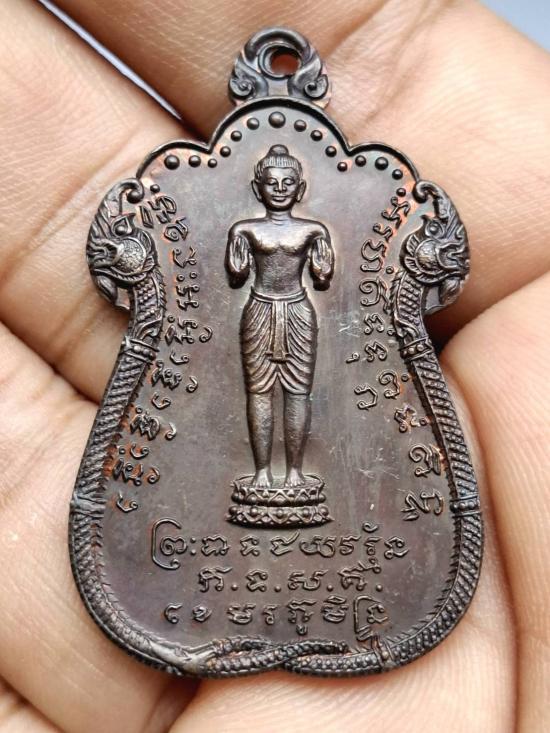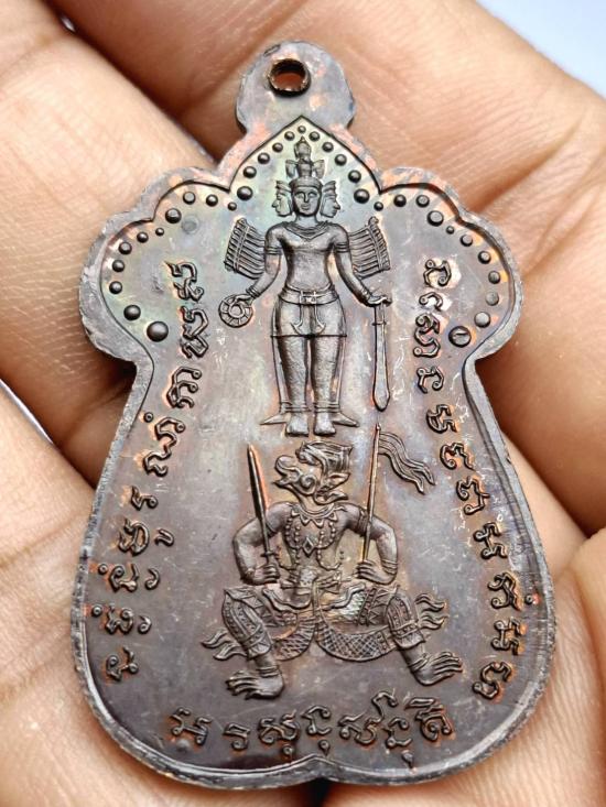 เหรียญพระเจ้าชัยวรมัน หลวงพ่อสร้อย สร้างให้เจ้าสีหนุ แจกทหารเขมร สมัยรบกับเขมรแดง หลวงปู่สรวงเสก เหรียญนี้หลายคนเรียกเหรียญพระปรางห้ามสมุทรแต่จริงๆแล้วเป็นพระเจ้าชัยวรมัน ถ้าคนอ่านภาษาขอมข้างใต้ออกจะเข้าใจ ด้านล่างเขียนชัดเจนว่า พระเจ้าชัยวรมัน..เหรียญสวยครับ |