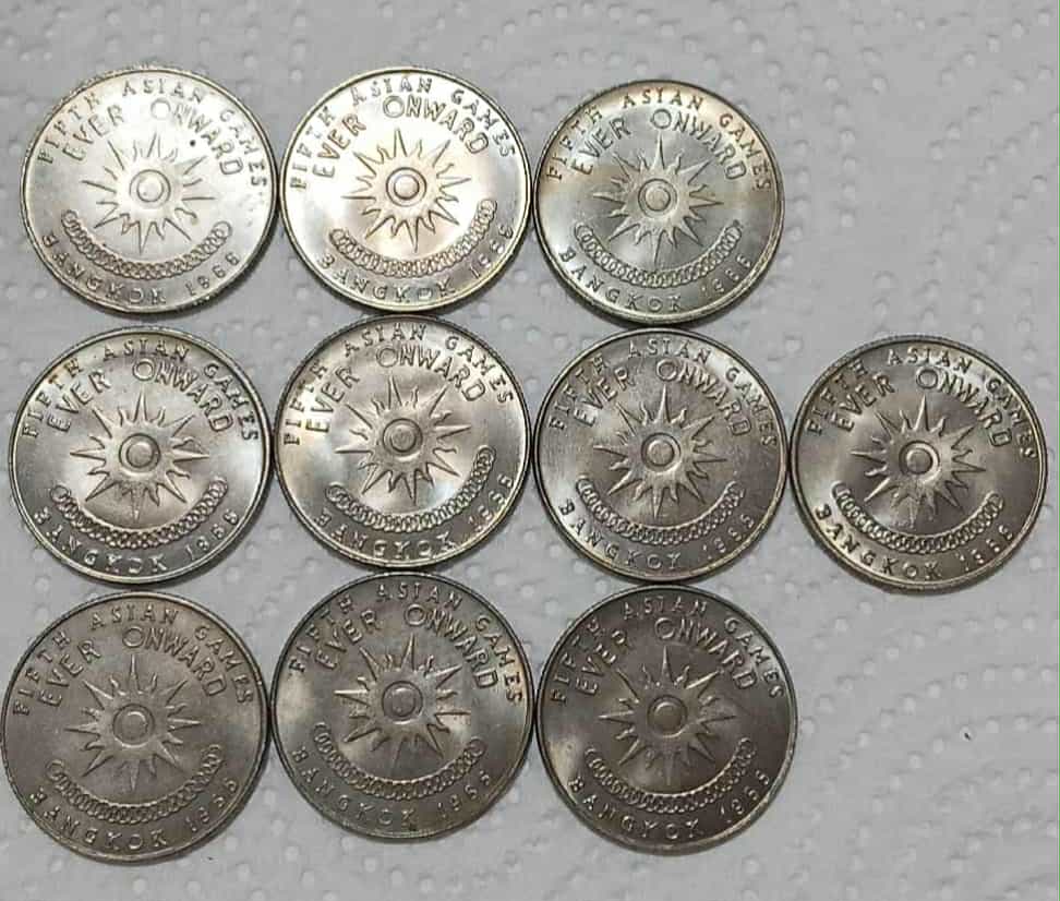 เหรียญ 1 บาท เอเชี่ยนเกมส์ ครั้งที่ 5 ในหลวงคู่ราชินี พ.ศ.2509 ในสมัยรัชกาลที่ 9 สภาพไม่ผ่านใช้งานผิวแกะถุง จำนวน 10 เหรียญ ครับ |