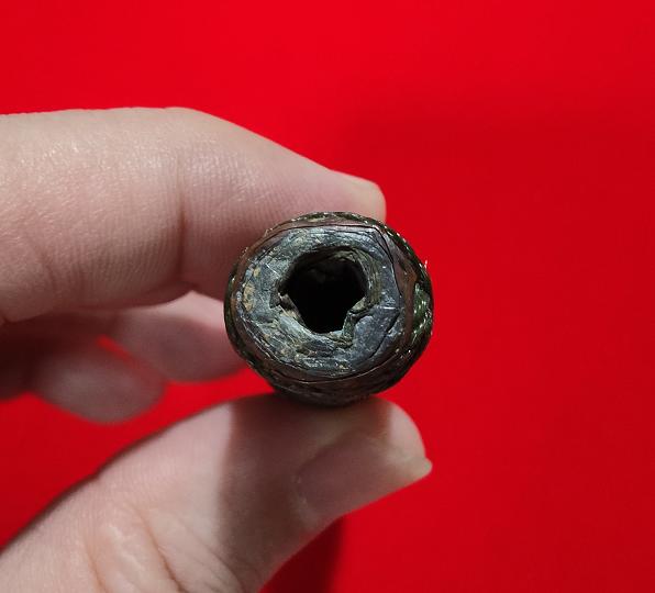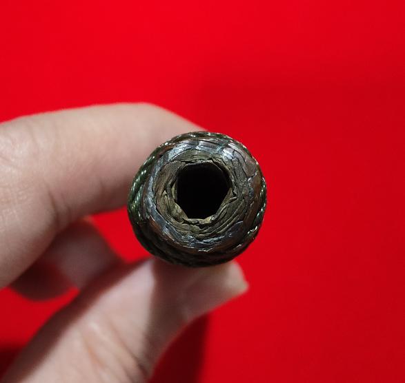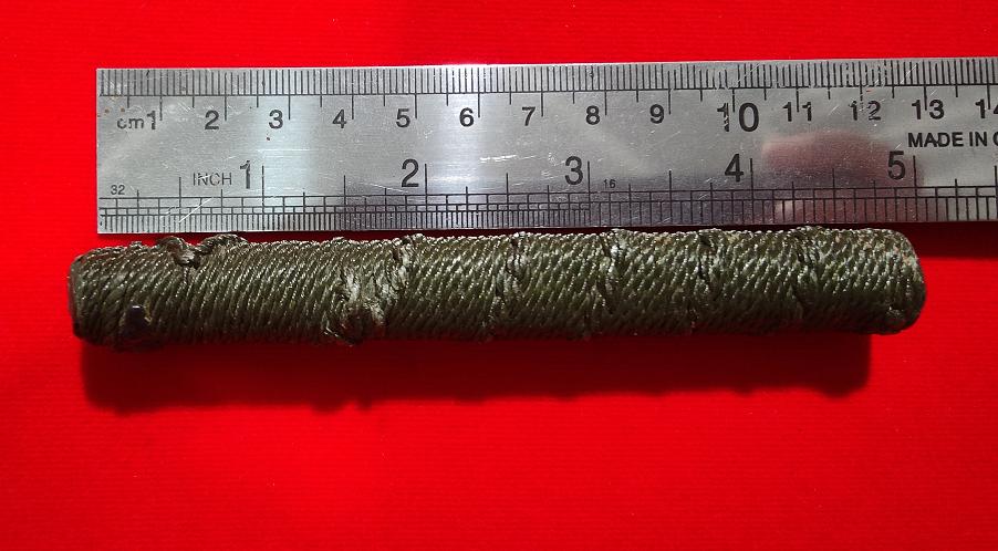 รายละเอียด ตะกรุดเนื้อสามกษัตริย์ หลวงพ่อทบ วัดพระพุทธบาทชนแดน เนื้อทองเหลือง+ทองแดง+ตะกั่ว ยาวเกือบ 5 นิ้ว