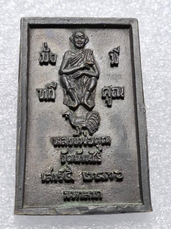 พระสมเด็จหลวงพ่อคูณ รุ่น มั่งมี ทวีคูณ พิธีเสาร์5 ปีระกา สร้างขึ้นเมื่อปี 2536 วัดบ้านไร่ จ.นครราชสีมา เนื้อโลหะทองแดงรมดำ ด้านหลังเหรียญหลวงพ่อคูณขี่ไก่ มั่ง มี ทวีคูณ |