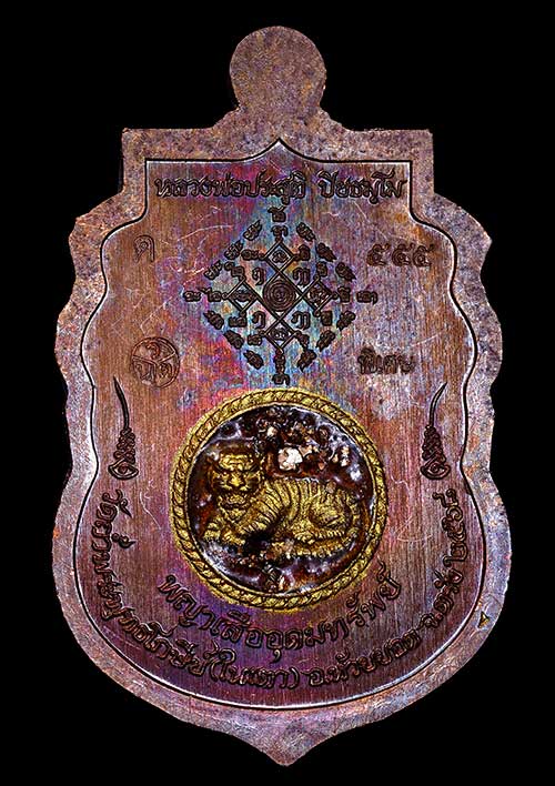 1 ใน 10 เหรียญเสมาพญาเสืออุดมทรัพย์ พระอาจารย์ประสูติ (หลวงพ่อประสูติ) วัดในเตา จ.ตรัง เนื้อทองแดงมันปูหน้ากากชุปเงิน ลงยาจีวรเพ้นท์ขอบทอง อุดมวลสารผงดวง 12 ราศี ผงเก่าหลวงปู่โต๊ะ เลขตองสวยๆNO.555