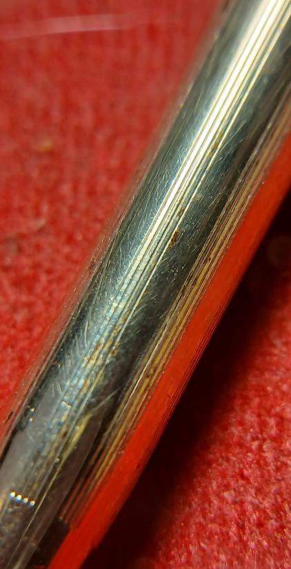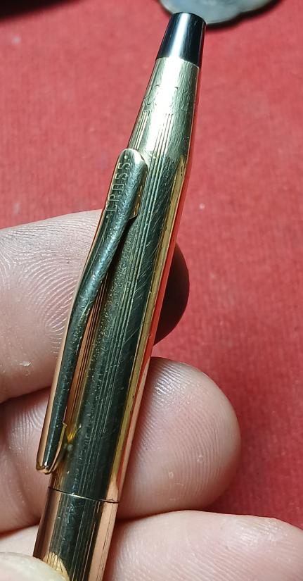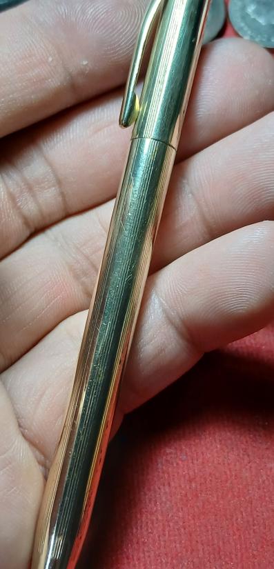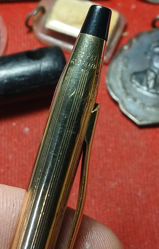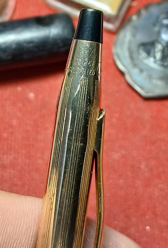 ปากกา cross 12K. เคาะเดียว สภาพไม่ค่อยสวยนะครับมีสนิมทองเกาะเป็นจุดๆตามรูป |