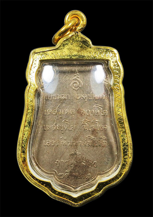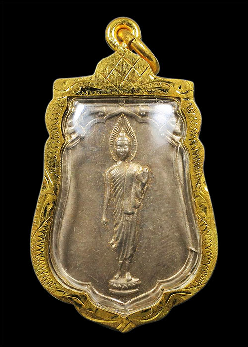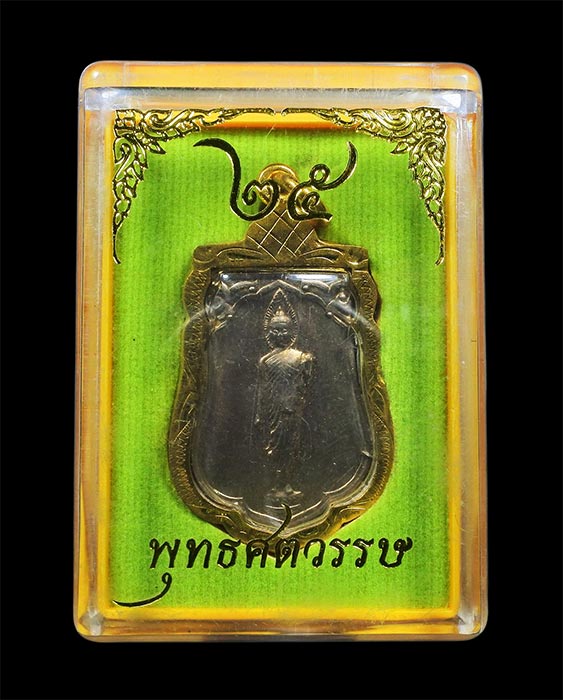 เหรียญเสมา พระพุทธ 25ศตวรรษ ปี2500 เนื้ออัลปาก้า เลี่ยมไมครอนทอง กล่องเดิม (2) |