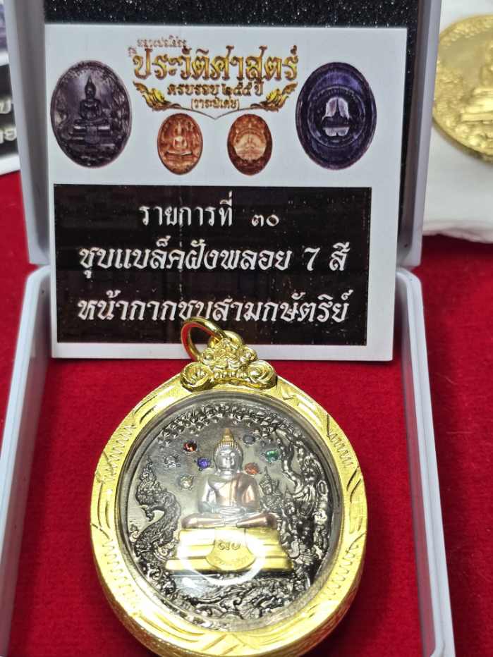เหรียญหลวงพ่อโสธรรุ่นประวัติศาสตร์ครบรอบ 255 ปี วาระพิเศษ (วัดสร้าง) เนื้อชุบBlack rodium ฝังพลอย 7 สี หน้ากากสามกษัตริย์ เลี่ยมกรอบทองไมครอน เลข24 พร้อมกล่องเดิม |