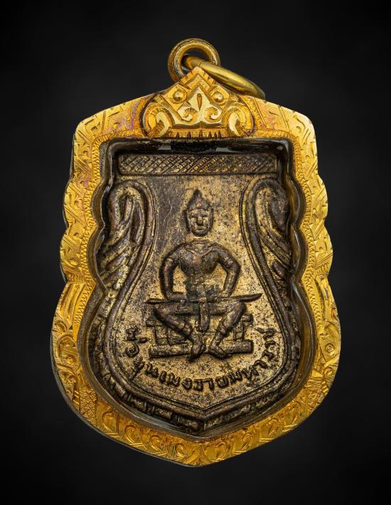 เหรียญพ่อขุนเม็งรายมหาราช พิมพ์หลังพระพุทธ เนื้อทองแดงกะไหล่ทอง ปี 2496 รุ่นแรก จ.เชียงราย เลี่ยมกรอบทอง 65%