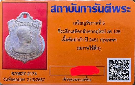 ชื่อพระเครื่อง เหรียญ ในหลวงรัชกาลที่ 5 เสด็จกลับจากยุโรป ปี 2450 และบัตร gpra เลี่ยมกันนำ้ตลับพุก