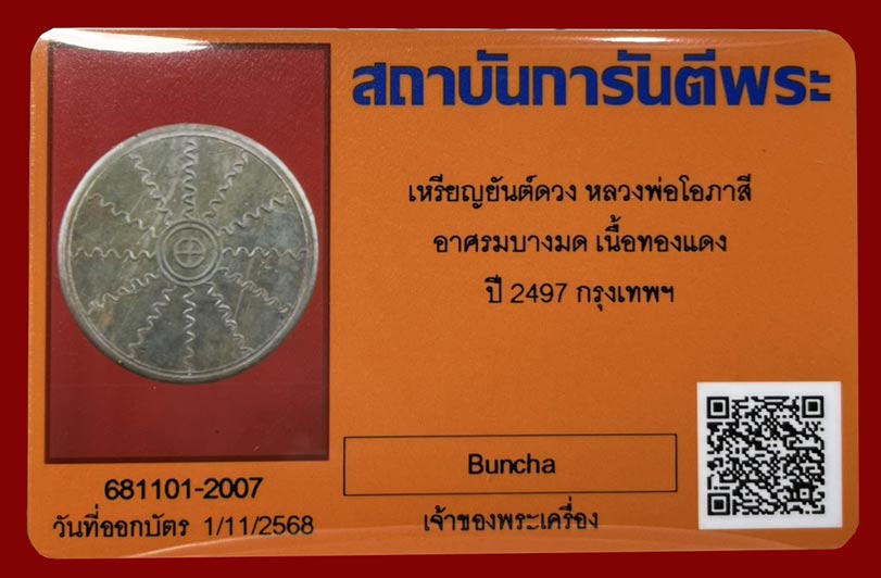 วัดใจ...เหรียญยันต์ดวง หลวงพ่อโอภาสี อาศรมบางมด ปี2497 เนื้อทองแดง ตอกโค๊ต คมชัด หายาก สภาพสวย พร้อมบัตรรับรองครับ.