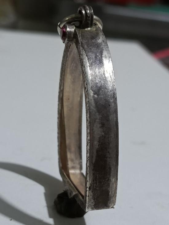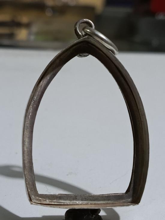 กรอบเงินเก่าแท้ ฝังพลอยแดง งานสั่งทำเก่า ใส่เหรียญเจ้าสัวหลวงปู่บุญและเจ้าสัวทุกรุ่น ขนาด 2.5 ซม.4.2 ซม.หนา 7 มม. หนาหนัก 4.83 กรัม |