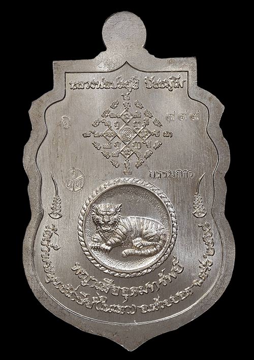 1 ใน 10 เหรียญเสมาพญาเสืออุดมทรัพย์ พระอาจารย์ประสูติ (หลวงพ่อประสูติ) วัดในเตา จ.ตรัง เนื้ออัลปาก้าลงยาน้ำเงินลงยาขอบพญานาคลงยาจีวร ตอกกรรมการ ฝังพลอยแดง เลขตองสวยๆNO.999(ที่สุดของเลขมงคล)