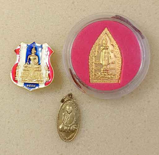 เข็มกลัดกะไหล่ทองลงยาลายธงชาติ หลวงพ่อวัดไร่ขิง ปี 59 +เหรียญพระร่วงเจ้าสัว วัดพระปฐมเจดีย์ ปี2545 จ.นครปฐม +เหรียญใบขี้เหล็กพิมพ์เล็ก หนุนดวง รุ่นพิเศษ หลวงปู่แผ้ว ปวโร |