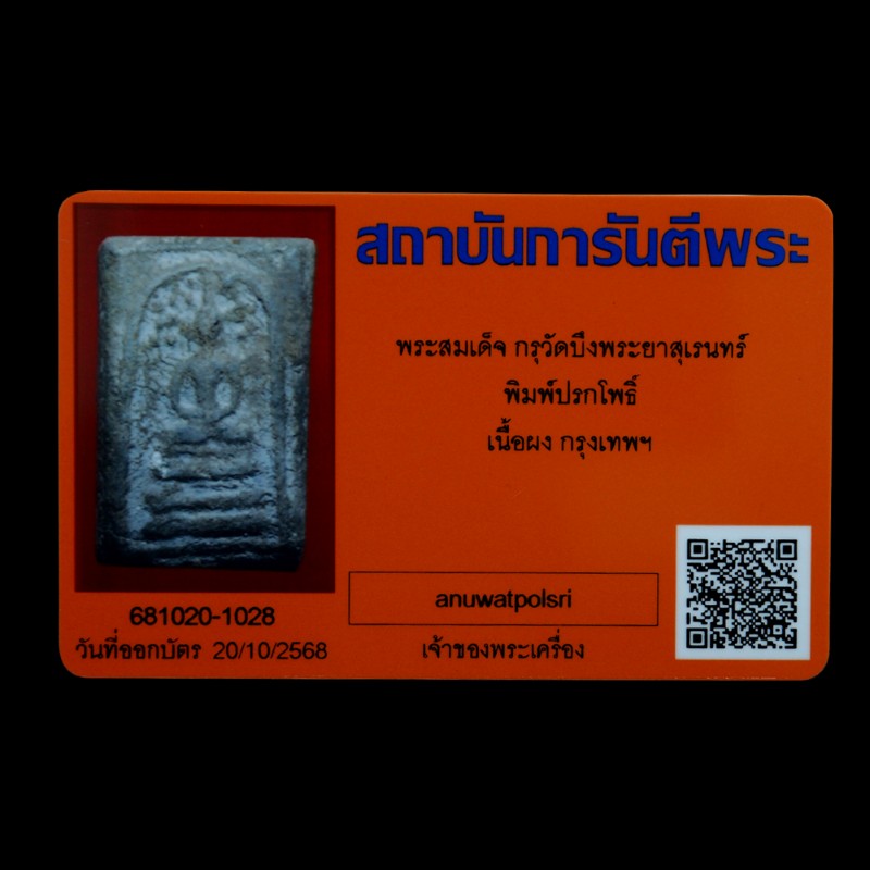 พระสมเด็จ กรุวัดบึงพระยาสุเรนทร์ พิพม์ปรกโพธิ์ เนื้อผง กรุงเทพฯ (กรุเก่า) พร้อมบัตร และตลับชุบทองฝังเพชร |