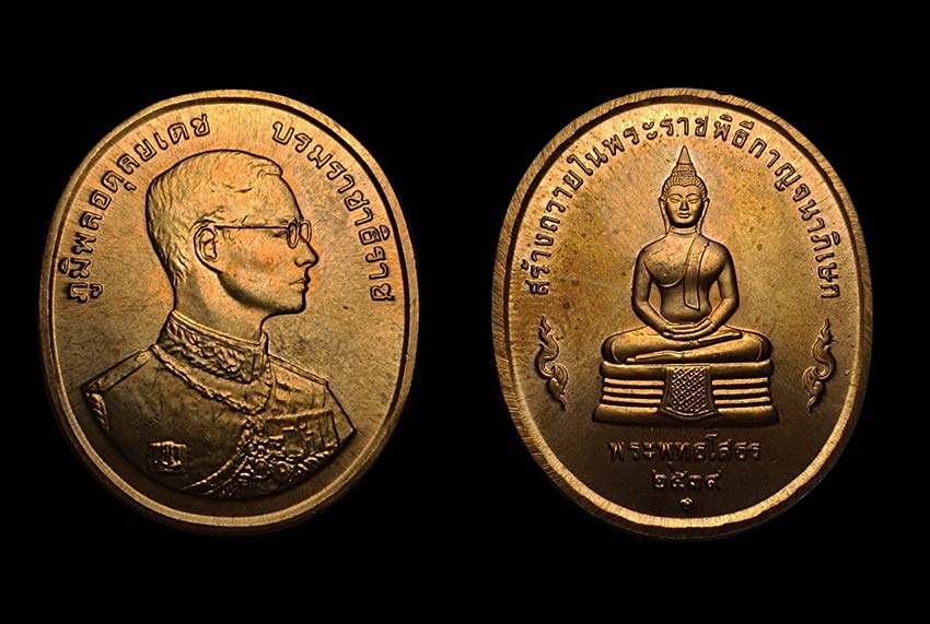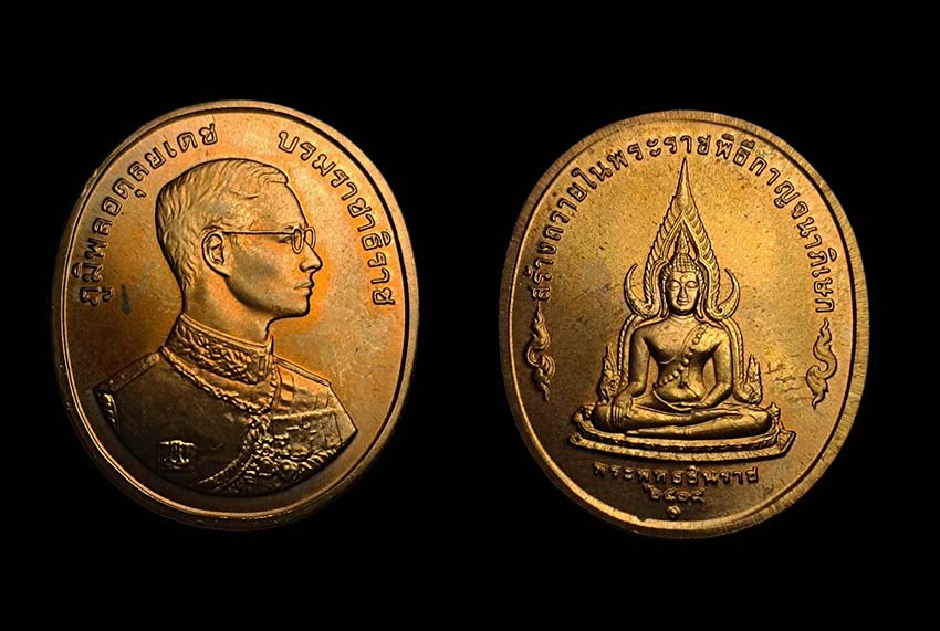 พระเหรียญชุดพระพุทธปัญจภาคี ครบชุด 5 เหรียญ ที่ระลึกพระราชพิธีกาญจนาภิเษก ในหลวงรัชกาลที่ 9 หลังหลวงโสธร, หลังพระพุทธชินราช, หลังพระพุทธชินสีห์, หลังพระมงคลบพิตร, หลังพระนิรันตราย ปี พ.ศ.2539 พร้อมกล่อง