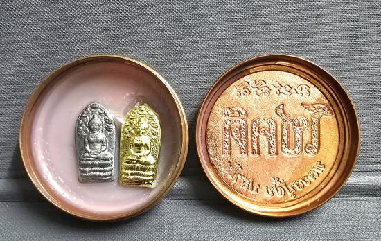 ตลับสีผึ้ง เนื้อทองแดงซาติน ลงยาโชคดี สีผึ้งปลุกเสกอุดเหรียญนากปรกใบมะขาม 2 องค์ หลังเลเซอร์ยันต์