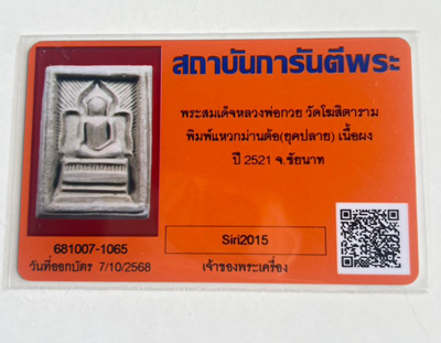 พระสมเด็จแหวกม่านหลวงพ่อกวย ปี 2521 เนื้อผง พิมพ์ต้อ วัดโฆสิตาราม จ.ชัยนาท ออกบัตรแล้วเรียบร้อย