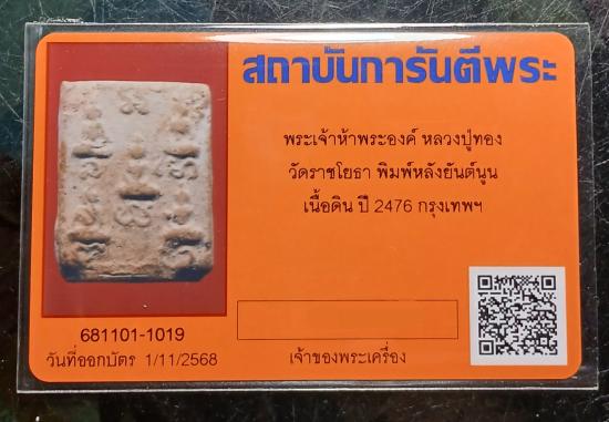 เคาะเดียวเบาๆ...พระหลวงปู่ทอง พิมพ์พระเจ้าห้าพระองค์ หลังยันต์ เนื้อดิน วัดราชโยธา ปี2476 จ.กรุงเทพ คัดสวยๆมาเลยครับ พร้อมบัตรรับรองจากทางเว็บ |