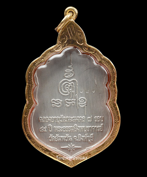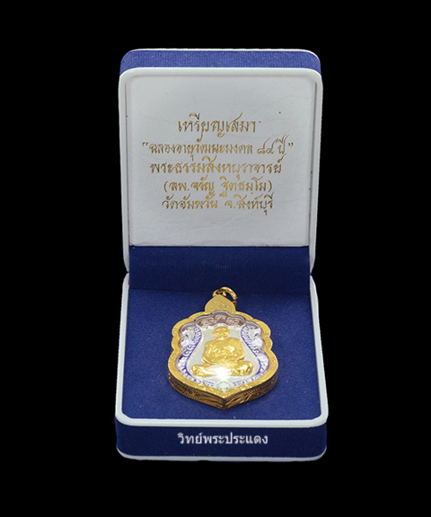 รายละเอียด **เคาะเดียวแดง**เหรียญเสมา 7 รอบ ฉลองอายุวัฒนมงคล 84 ปี หลวงพ่อจรัญ วัดอัมพวัน จ.สิงห์บุรี เนื้อเงินลงยา หน้ากากทองคำ หมายเลข 181 สภาพสวย เลี่ยมทอง พร้อมกล่องเดิม
