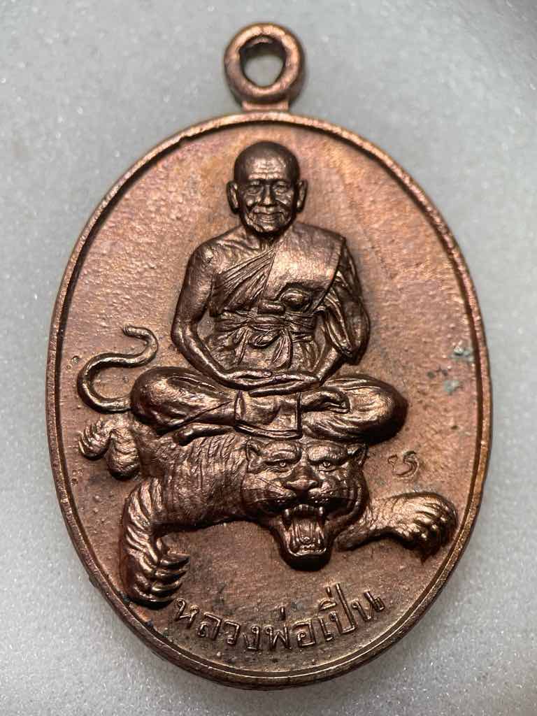 ด้านหน้าเหรียญ หลวงพ่อเปิ่นนั่งสมาธิบนหลังเสือ เป็นเอกลักษณ์แห่ง อำนาจ วาสนา บารมี
