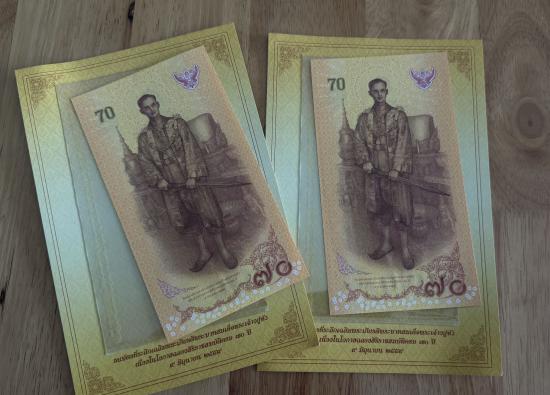 ## ธนบัตรที่ระลึก 70 บาท พระบาทสมเด็จพระเจ้าอยู่หัวรัชกาลที่ 9 ฉลองสิริราชสมบัติครบ 70 ปี ## ไม่ผ่านการใช้ 2 ฉบับ เดิมๆๆ |