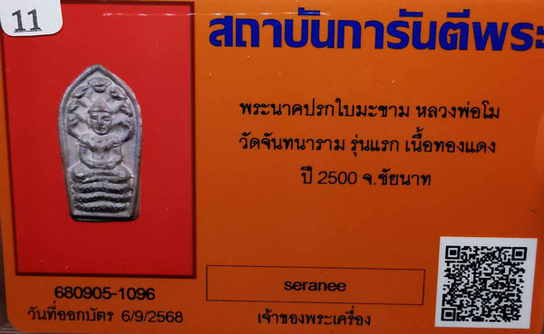 พระนาคปรกใบมะขาม หลวงพ่อโม วัดจันทนาราม รุ่นแรก เนื้อทองแดง ปี 2500 จ.ชัยนาท + บัตรG-pra สภาพเดิมค่ะ |