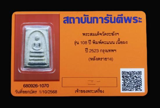 สมเด็จวัดระฆัง รุ่น อนุสรณ์108ปี พิมพ์คะแนน หลังตรายาง พร้อมบัตรรับรอง ครับ