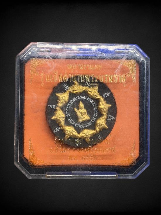 - องค์จตุคามรามเทพประทับนั่งกลางวงยันต์รัศมีพญานาค พร้อมลายอักขระจารึกโดยรอบ ปิดทองเสริมมงคล
