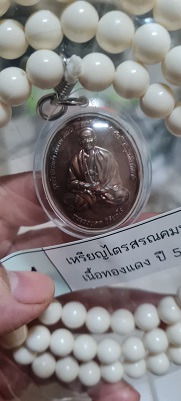 เหรียญไตรสรณคมน์ เนื้อทองแดง หลวงตาม้า วัดถ้ำเมืองนะ พร้อมรอยจารหลวงตาม้า เลี่ยมจากวัดพร้อมประคำ