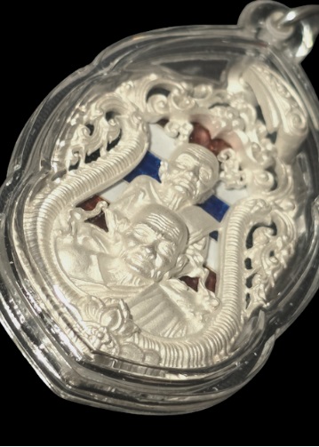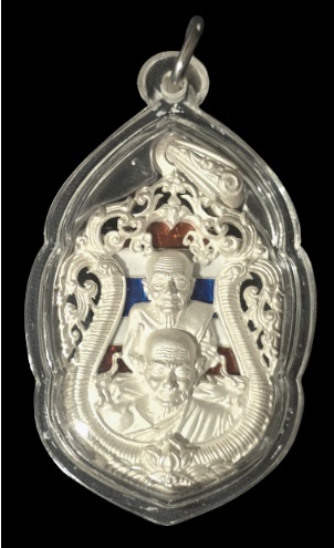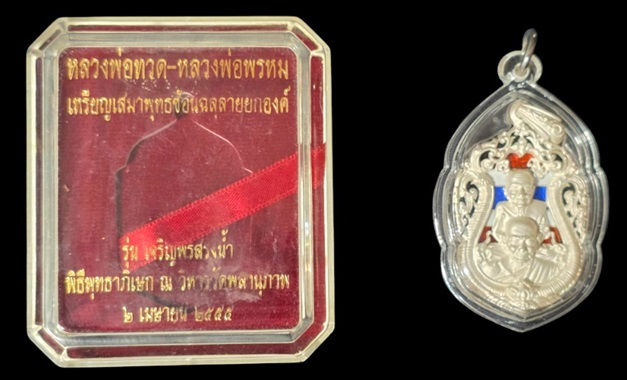 เหรียญเสมาฉลุลายยกองค์ หลวงพ่อทวด-พ่อท่านพรหม พิมพ์พุทธซ้อน รุ่นเจริญพรสรงน้ำ พ่อท่านพรหม วัดพลานุภาพ จ.ปัตตานี ปี 2555 **เนื้อเงินลงยาลายธงขาติ** หมายเลข ๔๐๖ เลี่ยมกันน้ำสภาพสวย มาพร้อมกล่องเดิม