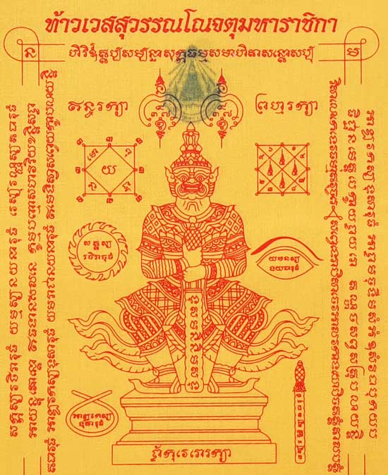 ผ้ายันต์ท้าวเวสสุวรรณโณ วัดจุฬามณี หลวงพ่ออิฎฐ์ ปั๊มตรายางวัดจุฬามณีขนาดA4 ปี2557 พื้นสีเหลืองตัวหนังสือสีแดง |