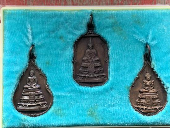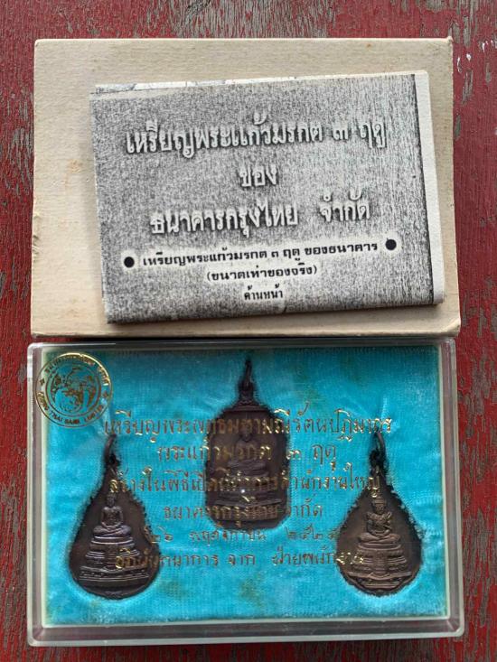 กล่องชุด 3 เหรียญ เหรียญพระแก้วมรกต 3 ฤดู "ที่ระลึกในพิธีเปิด ธ.กรุงไทย สนง.ใหญ่" ปี 2525 เนื้อทองแดง (ลป.ดู่ วัดสะแก ปลุกเสก) พร้อมกล่อง |