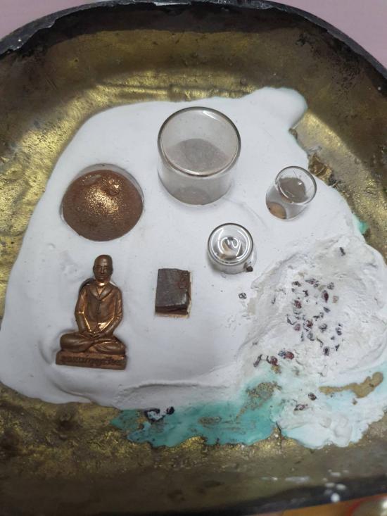 อุดมวลสาร ผงอัฐิกระดูกคุณแม่ เกศา ผงพระพุทโธน้อยรุ่นแรก พลอยเสก ลูกอมมวลสาร ข้าวตอกพระร่วง ทหายเงิน ทรายทอง และมวลสารรวมๆภายในองค์พระ และฝัง รูปเหมือนปั้มรุ่นแรกปี 2560 หลวงปู่ช่วงวัดอาวุธเสก