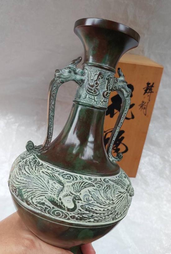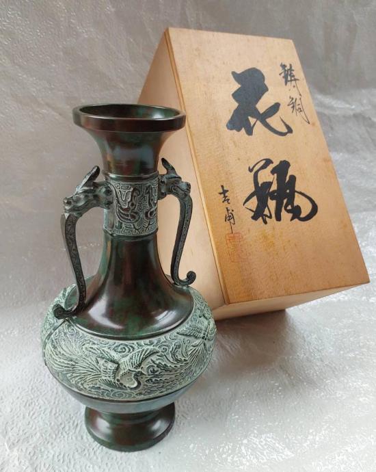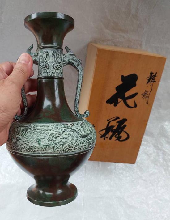 ***วัดใจ***แจกันเก่าเก็บทรงโบราณ หูมังกร เนื้อโลหะ สูง 10 นิ้ว พร้อมกล่องไม้เดิมๆ สวยๆ |