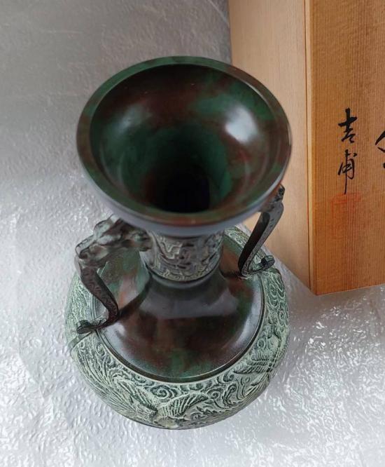 ***วัดใจ***แจกันเก่าเก็บทรงโบราณ หูมังกร เนื้อโลหะ สูง 10 นิ้ว พร้อมกล่องไม้เดิมๆ สภาพใหม่วิ้ง |