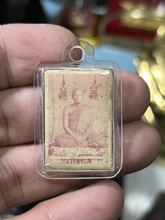 รูปถ่ายกระดาษไข่ปลา หลังผ้าจีวร ปั้มยันต์ หลวงพ่อแพ วัดพิกุลทอง ปี2517 เลี่ยมเก่า |