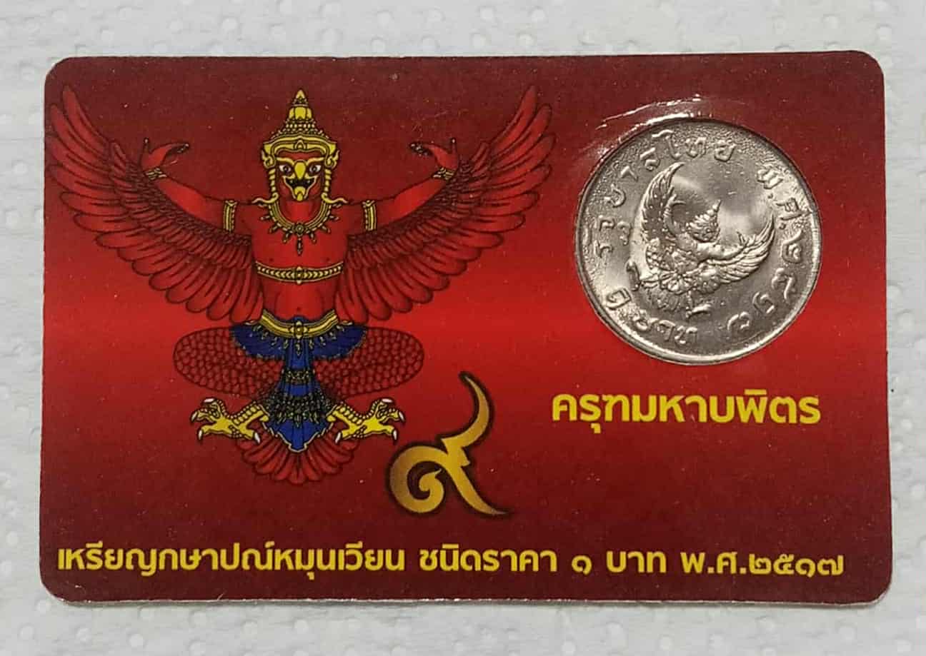 เหรียญ 1 บาท หลังครุฑ พ.ศ.2517 ในสมัยรัชกาลที่ 9 พร้อมการ์ดสีแดง พกติดตัวไว้เป็นมงคล เหรียญสภาพไม่ผ่านการใช้งาน จำนวน 1 เหรียญ ครับ ((ด้านก้อยพระเศียรเอียง อยู่ประมาณตรงเลข 7 ครับ)) |