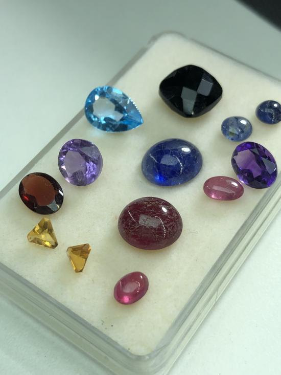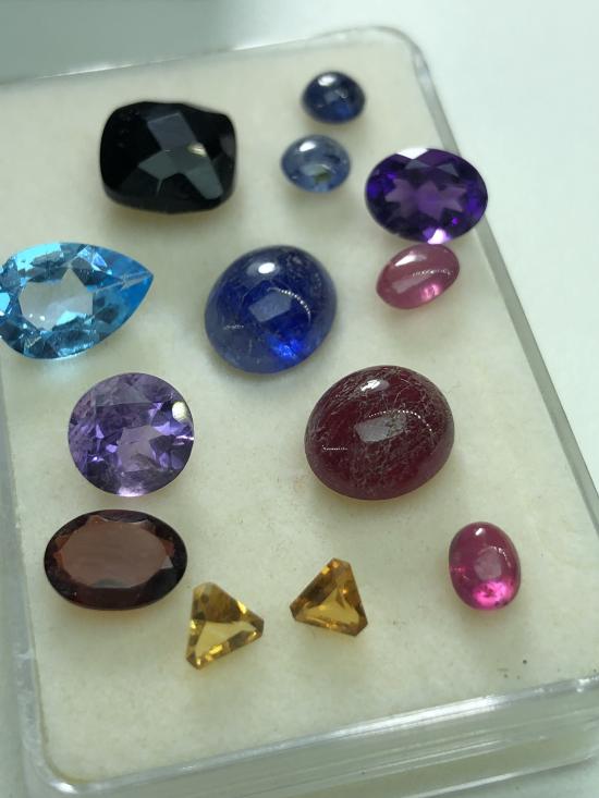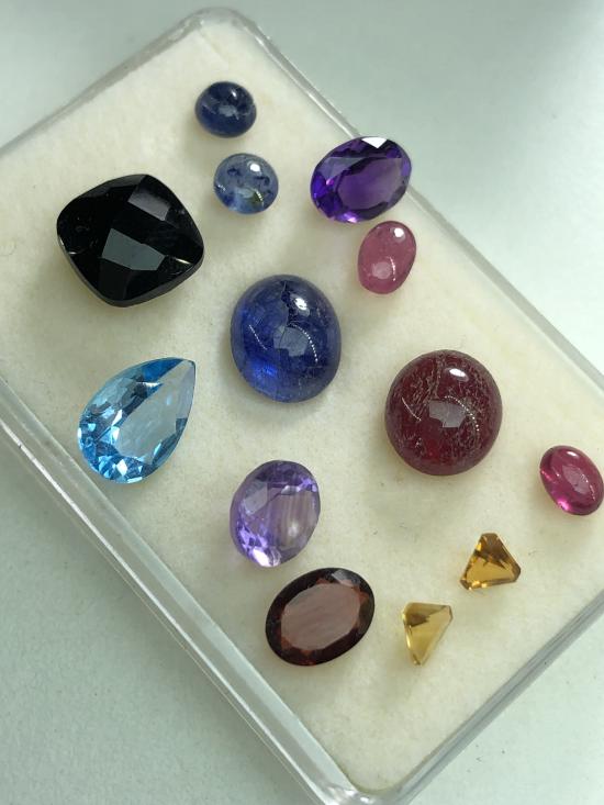 อัญมณีแกะจากสินหลุดจำนำ ไพลิน ทับทิม นิล โทแพส อเมทิส ซิทริน โกเมน น้ำหนักรวม 19 กะรัต รับประกันแท้ทุกเม็ด (บางเม็ดหน้าพลอยเป็นรอย สามารถให้ช่างปัดหน้าพลอยให้ใหม่ก่อนขึ้นตัวเรือนใหม่) |